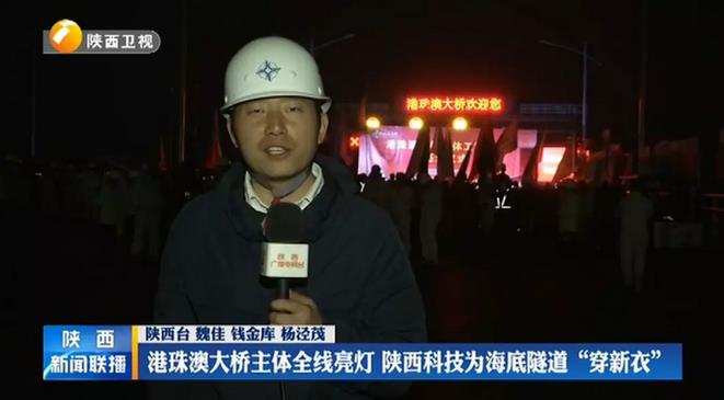 記者:“這里是位于香港和珠海交界處的港珠澳大橋東人工島,今天晚上,在這里舉行港珠澳大橋主體工程全線亮燈儀式,來自陜西的建設者也將在這里度過一個難忘的跨年夜。”
